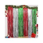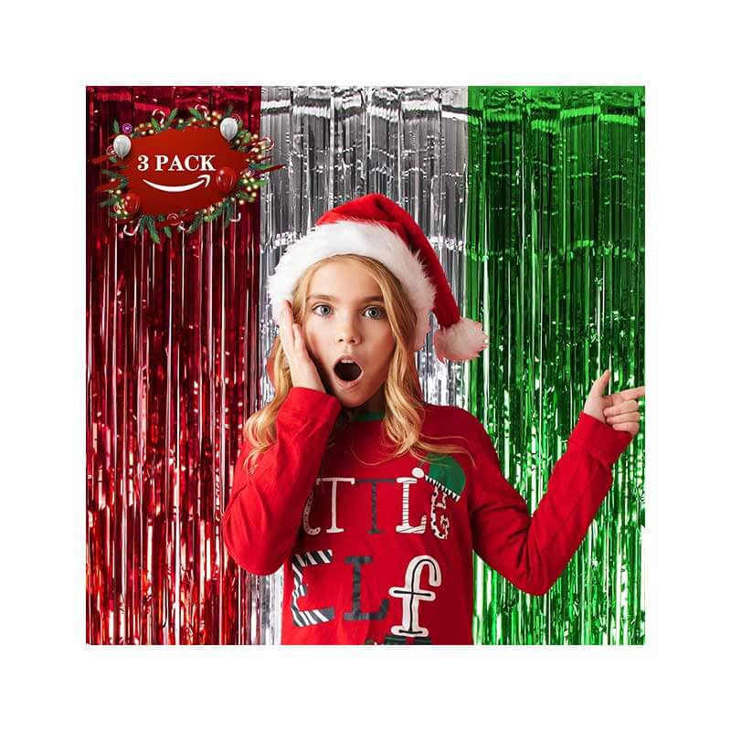 • CHRISTMAS PARTY DECORATION: 3 packs of Christmas-themed red silver and green foil fringe curtains, size (width x drop) 3.3 x 6.6 ft each, perfect for Christmas party, New Year’s Eve party, Friendsmas party, Ugly sweater party, and general party decorations.