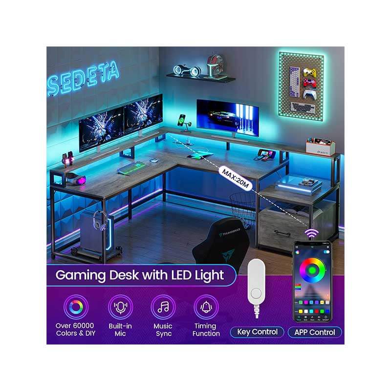 • 【Cool & Smart Led Light Strips 】The Sedeta gaming desk comes with RGB LED light strip, remote control via APP, Over 60000 colors and 29 flashing modes for your to choose. Led light strip with music sync function, built-in sensitivity adjustable mic, led light color will change with the rhythm of the sound and music. And with timer function, just enjoy it in a smart way, create gaming and working atmosphere. Light Up Your Gaming with LED Light Strip.